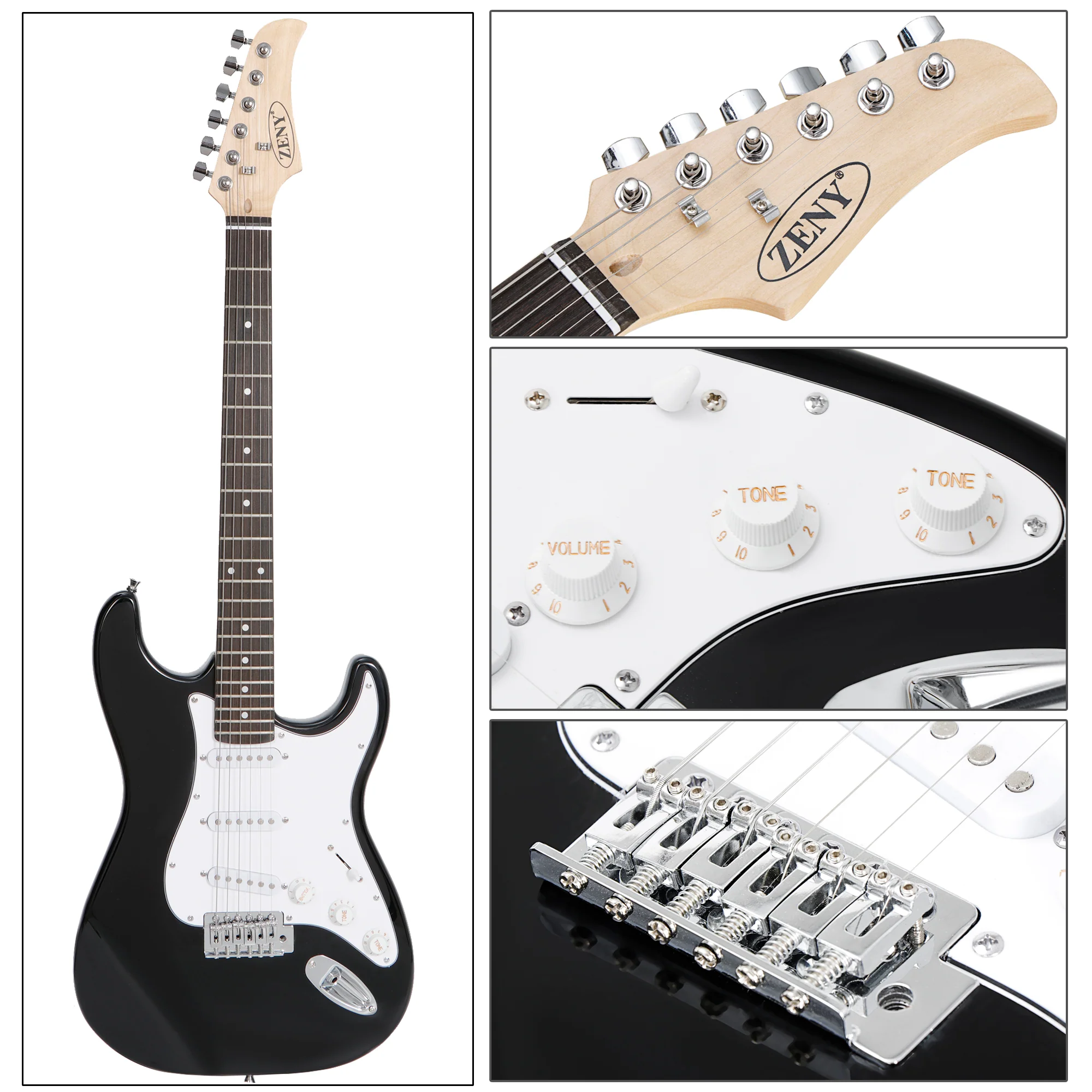 ZENY full size 39" beginner guitar has a basswood fret board and maple neck. The guitar features a three pickup configuration, with a pick up selector knob to mold your tone. The neck has 21 frets, and is supported by a fully adjustable truss rod. There are black and blue two colors for you to choose, which can satisfy your different aesthetics.