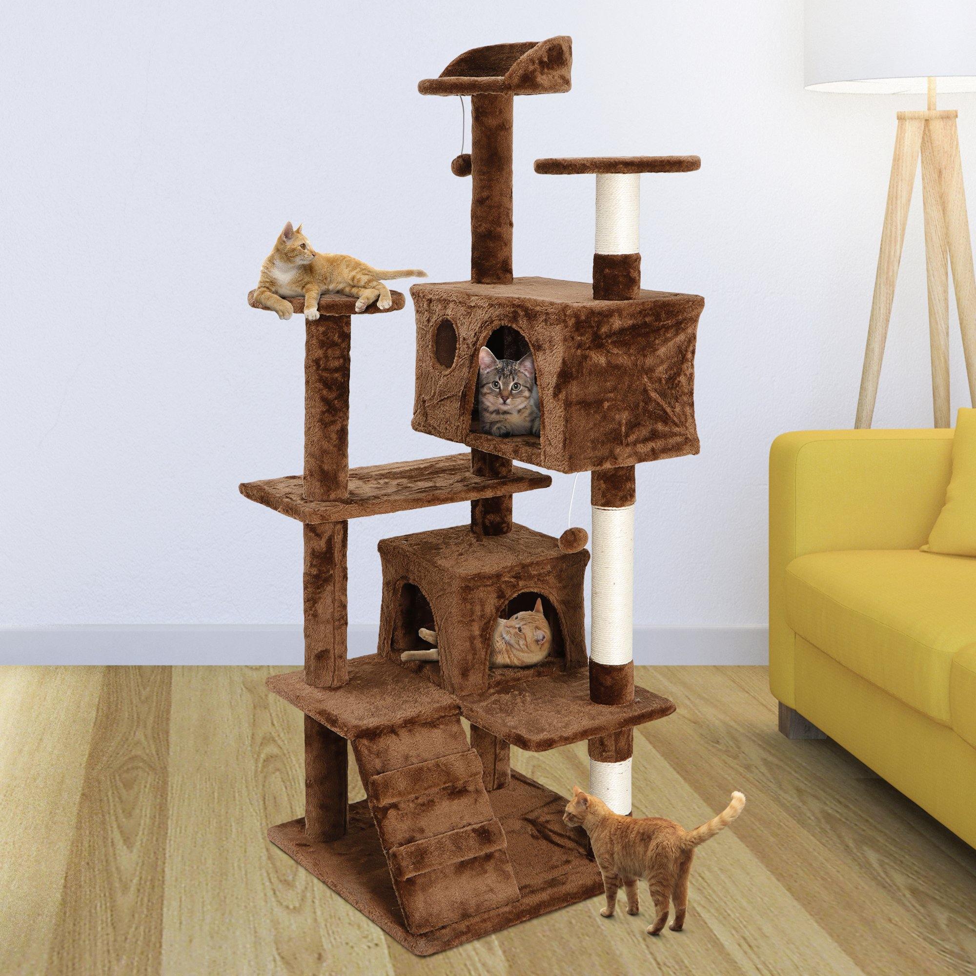 - Roomy and Enjoyable - 2 spacious hideaway houses offer super soft and warm lounging spots, sisal rope coiled posts help develop positive scratching habit, 3 top perches platform to enjoy the feeling of being at the top of the world and sit on to look out the window, multi-layer structure design, convenient for cat's scratching, climbing, sleeping, and exercising.