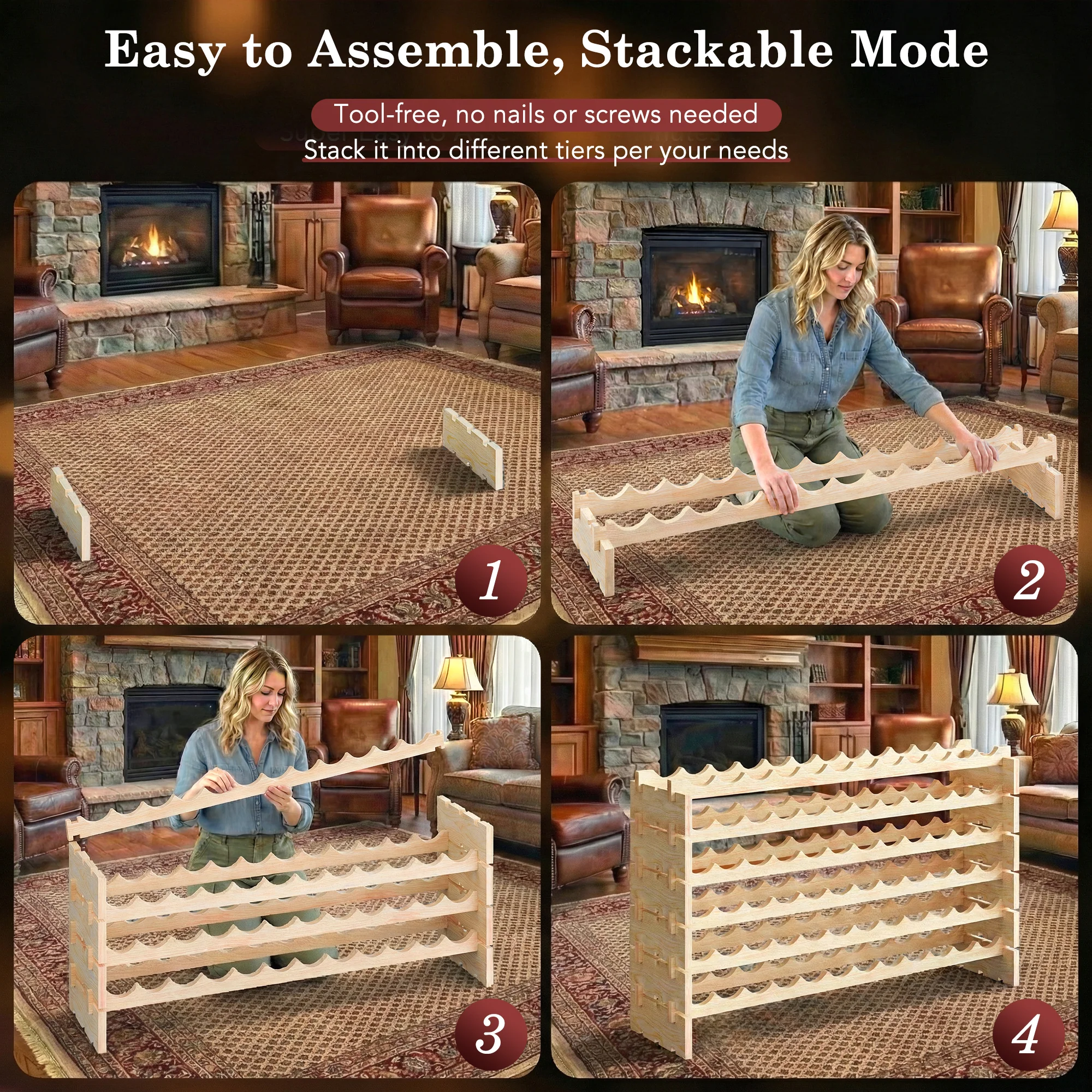 - 【6-Tier Stackable Design】- This wine bottle holder features a layered structure with stackable design and the arc design prevent wine bottles from sliding off the shelves. Each piece of the wood has notches and slots which are deep so they can fit together well and dowel pins to lock, makes the wine rack more sturdy and wobble-free on the floor.